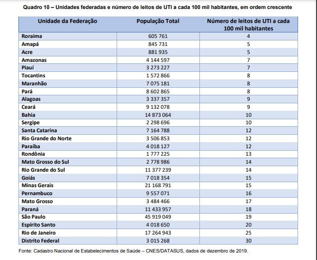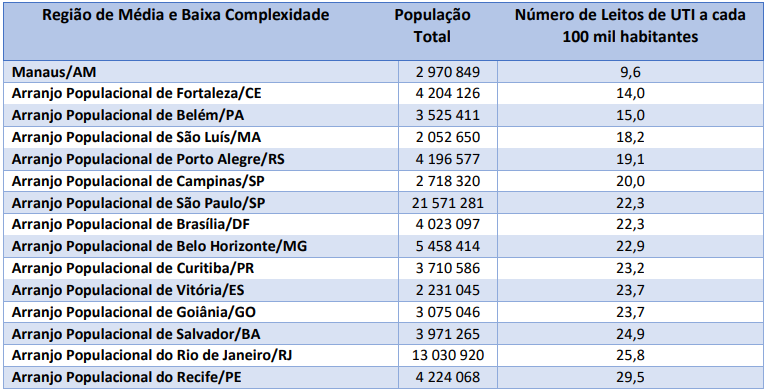 Em dezembro de 2019, a situação, de acordo com os dados da Instituto Brasileiro de Geografia e Estatística (IBGE), entre as regiões de saúde cuja população é superior a 500 000 habitantes, destacam-se, por apresentarem um baixo índice, as seguintes regiões: Vitória da Conquista/BA, com uma população total de 805 505 habitantes, que possui um índice de 11 leitos de UTI a cada 100 000 habitantes; e Marabá/PA, com população de 569 686, que possui um índice de 3,4 leitos de UTI a cada 100 000 habitantes. Requer atenção as regiões que, embora apresentem população superior a 200 000 habitantes, não possuem nenhum leito de UTI.