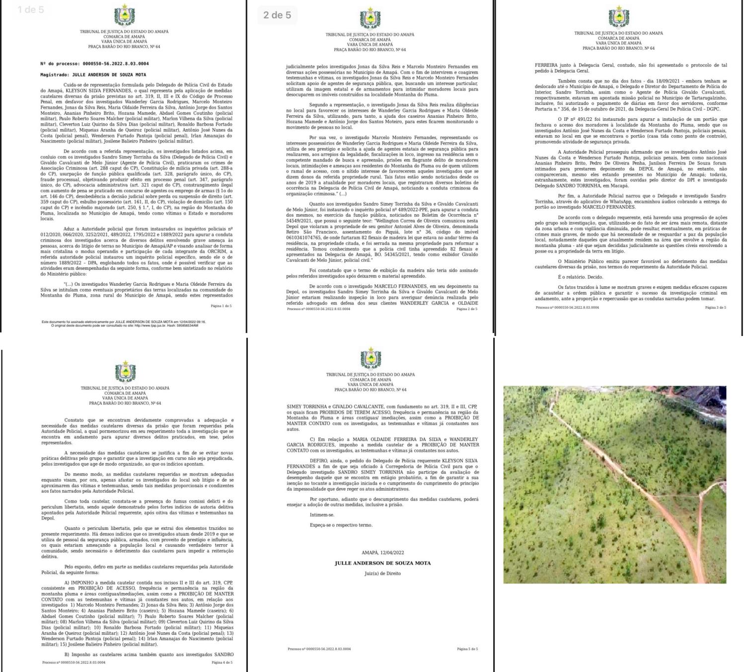 O Juiz Julle Anderson de Souza Mota, da vara única do município de Amapá, acatou o pedido do delegado Kleyson Silva Fernandes e decidiu impedir que o Delegado Sandro Torrinha, além de um policial civil, dois policiais penais, oito policiais militares e mais 7 pessoas tenham acesso a região da Montanha Pluma, localizada no município de Amapá e mantenham contato com os investigados, as testemunhas e vítimas do caso. O grupo de agentes da segurança pública e moradores do local estão sendo investigados por 10 crimes.