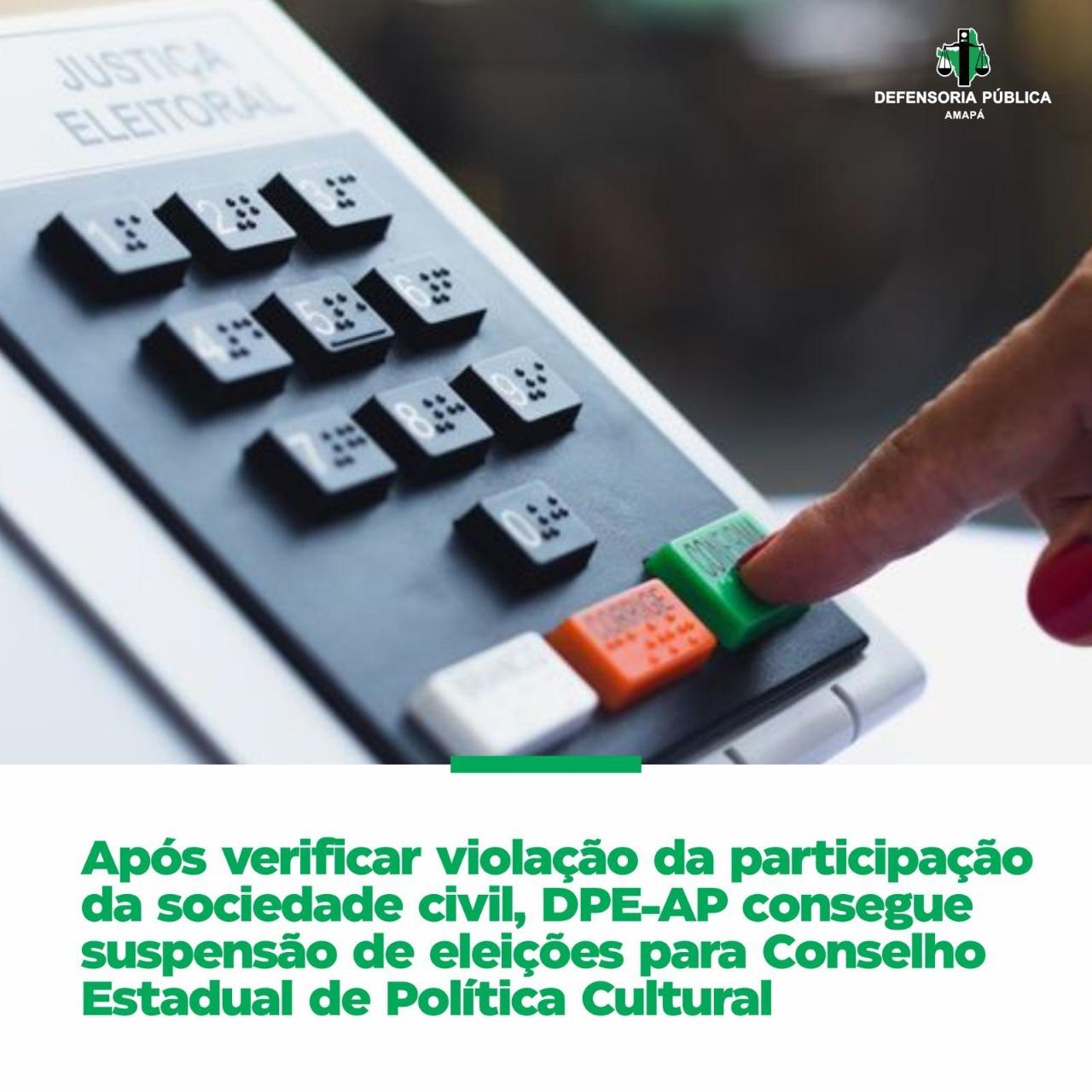 A Defensoria Pública do Estado do Amapá (DPE-AP) conseguiu na Justiça, através de Mandado de Segurança Coletivo, a suspensão das eleições para o Conselho Estadual de Política Cultural (CEPC), que ocorreriam no próximo domingo, 21. O pedido aconteceu após ser identificada violação da participação da sociedade civil no processo, descumprindo o Estado Democrático Social de Direito.