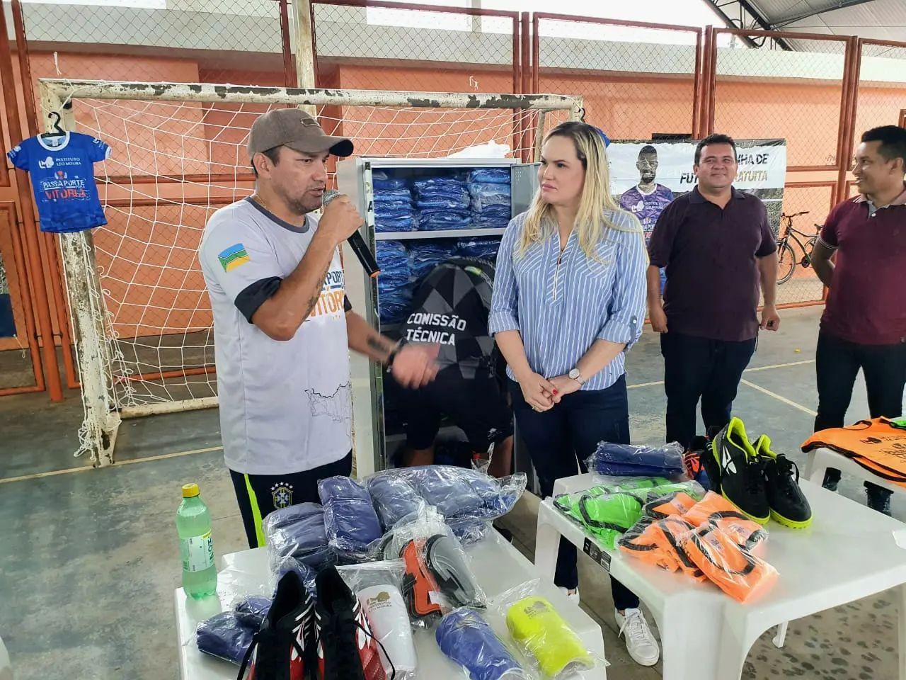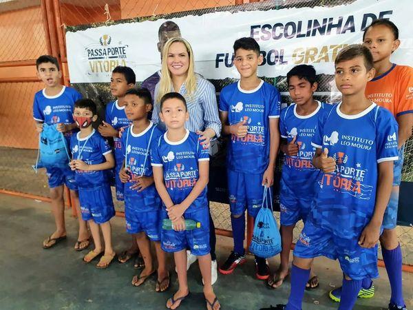 “Hoje realizamos a entrega dos kits de material esportivo da escolinha de futebol Passaporte para Vitória, do Instituto Léo Moura, implantada no município de Pedra Branca por meio de emendas destinadas pelo senador @davialcolumbre para que o programa se estendesse ao Amapá. Esse momento é o mais aguardado pelas 300 crianças e adolescentes da faixa etária de 5 a 15 anos, selecionados para o projeto.”, definiu a prefeita.