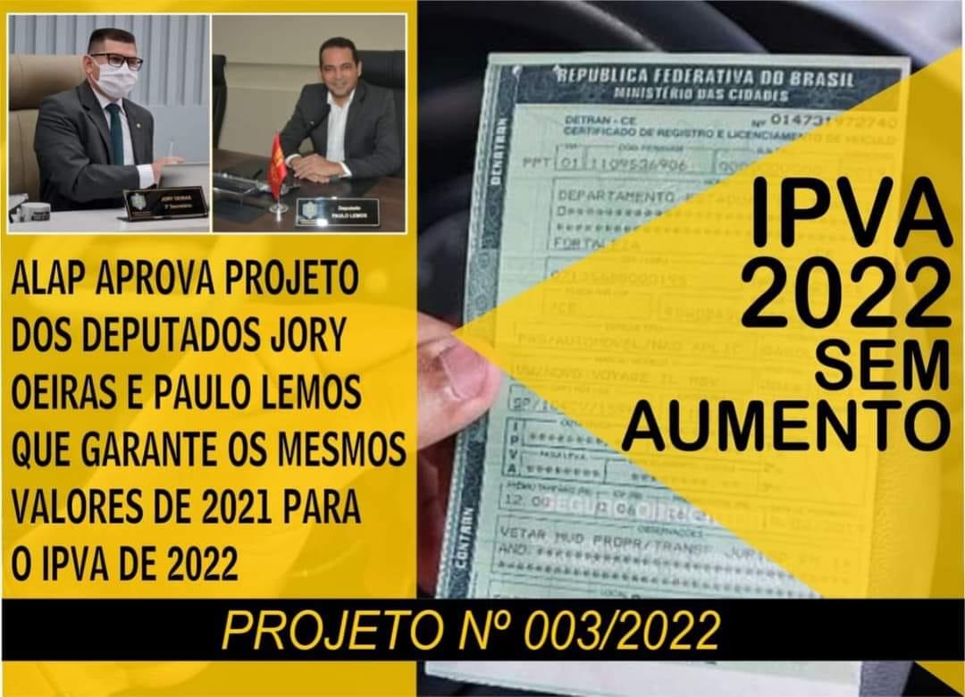 Agora o projeto será sancionado pelo governador, para que, após sua publicação no Diário Oficial do Estado, seja devidamente cumprido pela receita estadual, a fim de que os proprietários de veículos automotores do Estado paguem o IPVA de 2022 com os mesmos valores de 2021.