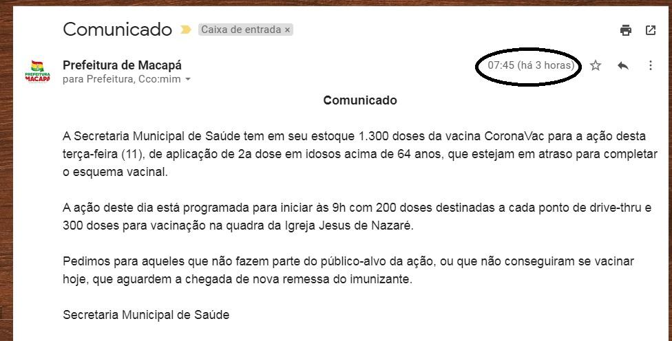 Às 07:45 da terça-feira (11) a Secretaria de Saúde expediu um Comunicado onde declarava que tinha em seu estoque 1.300 doses da vacina CoronaVac para a ação desta terça-feira (11), de aplicação de 2a dose em idosos acima de 64 anos, que estejam em atraso para completar o esquema vacinal.