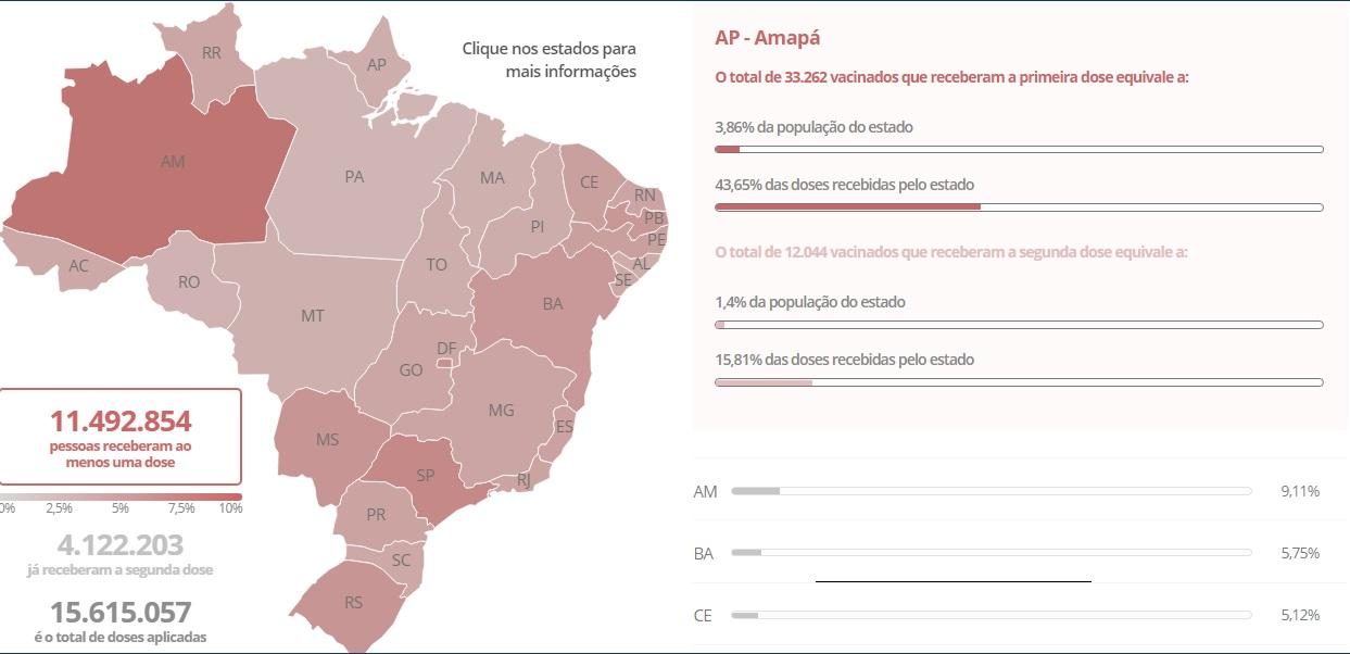 Dados publicados apontam que 10.984.488 pessoas tomaram a primeira dose e 4.027.123 a segunda, num total de mais de 15 milhões de doses aplicadas no Brasil. Nesses dois meses de vacinação o Amapá já imunizou com a 1ª doses 33.245 (3,86%) e com a 2ª dose - 11.919 (1,38%) amapaenses.