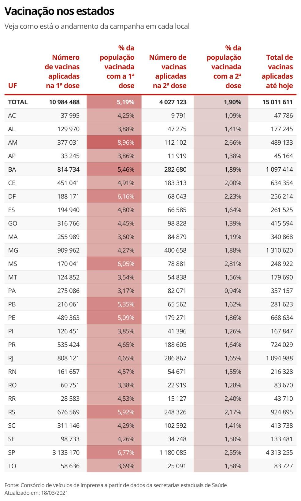 Em todo o Brasil levantamento aponta que 10.984.488 pessoas já receberam a primeira dose de vacina contra a Covid-19. O número representa 5,19% da população brasileira. A segunda dose já foi aplicada em 4.027.123 pessoas (1,90% da população do país) em todos os estados e no Distrito Federal. No total, 15.011.611 doses foram aplicadas em todo o país.
