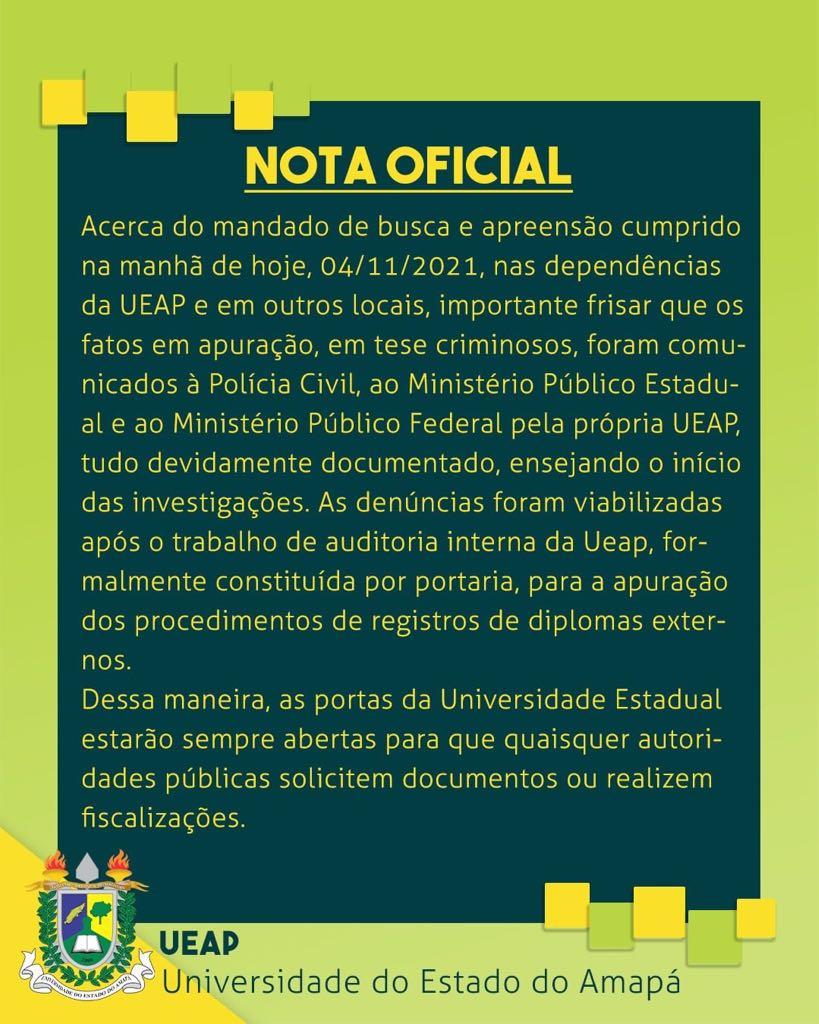 "Os fatos em apuração, em tese criminosos, foram comunicados à Polícia Civil, ao Ministério Público Estadual e ao Ministérios Público Federal pela própria Ueap, tudo devidamente documentado, ensejando o início das investigações", informou o documento. (Fonte G1 Amapá e Policia Civil)