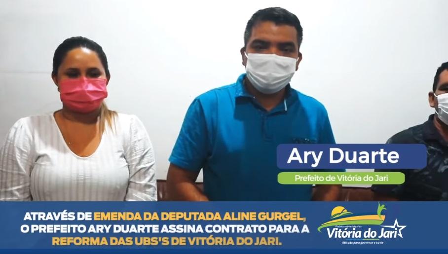 O Prefeito Ary Duarte assinou junto com a Secretária de Saúde Jaynne Duarte o contrato de empresas para executar reformas nas UBS's Caulim, Cidade Livre, Beira Rio e Santa Clara. Além dos empresários Elson e Manoel, estavam presentes na reunião o Secretário Municipal de infraestrutura Lindomar Pastana, a Coordenadora do Fundo Municipal de Saúde e a senhora Karen Leão Presidente da Comissão de Licitação da Secretaria de Saúde.
