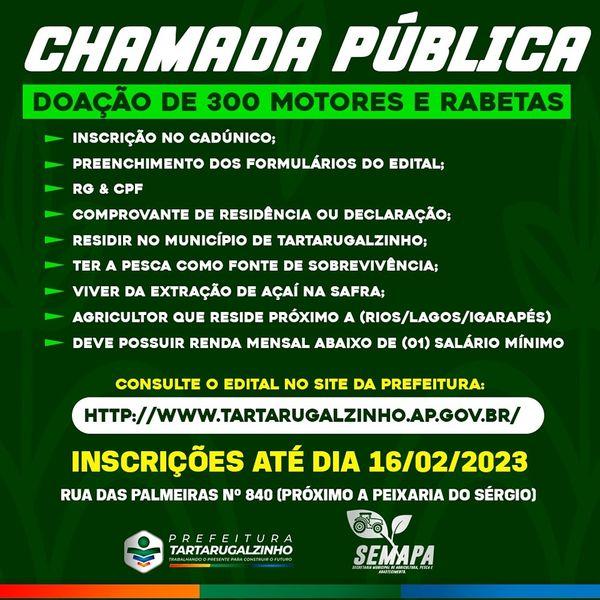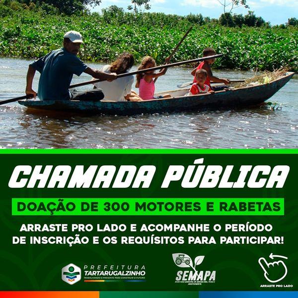 A Prefeitura de Tartarugalzinho, vem se esforçando para melhorar a qualidade de vida de sua população, e pensando nisso, realizará a entrega de 300 motores rabeta. O edital está disponível no site da Prefeitura, e as inscrições vão até o dia 16/02.