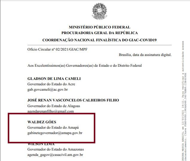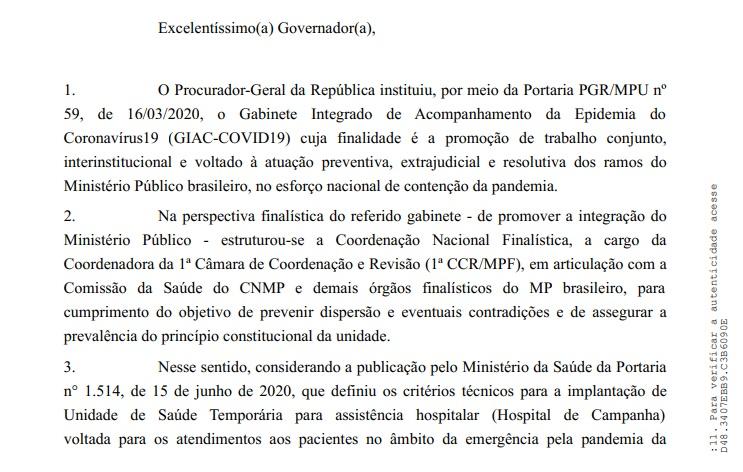 O ofício é assinado pela subprocuradora-geral da República Lindôra Maria Araújo, que integra o Gabinete Integrado de Acompanhamento da Epidemia do Coronavírus da PGR. O órgão foi criado há exatamente um ano pelo procurador-geral da República, Augusto Aras, e atua de forma preventiva, extrajudicial e resolutiva na contenção da pandemia no âmbito do Ministério Público da União.