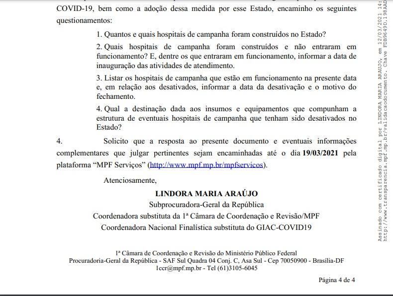 A subprocuradora quer que os governadores listem ainda os hospitais de campanha que atualmente estão em funcionamento em seus Estados e, em relação aos que foram eventualmente desativados, informem a data da desativação e o motivo do fechamento.