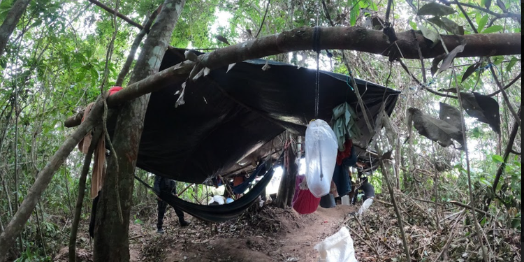 Na fazenda, os fiscais encontraram o grupo vivendo em um alojamento improvisado no meio da mata, coberto com lona fixada em árvores e estacas de madeira, nas proximidades da frente de trabalho. O chão era de terra batida, com desníveis e buracos, sem proteção lateral, o que possibilitava o acesso de animais no local.