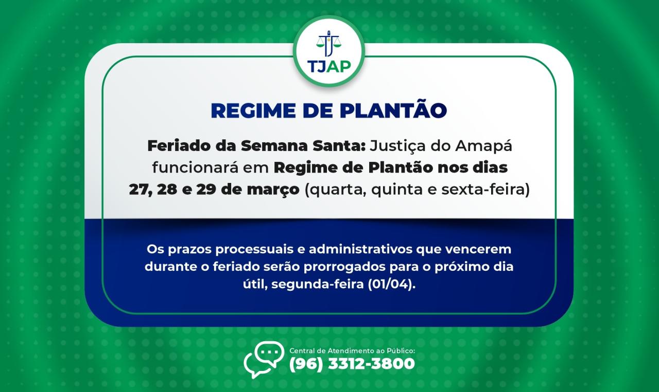 O Tribunal de Justiça do Amapá (TJAP) funcionará em Regime de Plantão de quarta-feira a sexta-feira, dias 27, 28 e 29 de março de 2024, período que corresponde à Semana Santa, Feriado Nacional, previsto no Regimento Interno do TJAP (o Artigo nº 88, parágrafo único, inciso II da Resolução nº 006/2003 – TJAP) e na Resolução 71/2009 do Conselho Nacional de Justiça (CNJ).