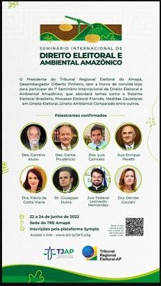 As inscrições para o 1° Seminário Internacional de Direito Eleitoral e Ambiental Amazônico estão abertas. O evento será realizado nos dias 22, 23 e 24 de junho, de forma presencial, no Plenário do Tribunal Regional Eleitoral do Amapá. O seminário vai abordar temas como o Sistema Eleitoral Brasileiro, Processo Eleitoral Brasileiro e Francês, Medidas Cautelares em Direito Eleitoral e Direito Eleitoral Comparado.